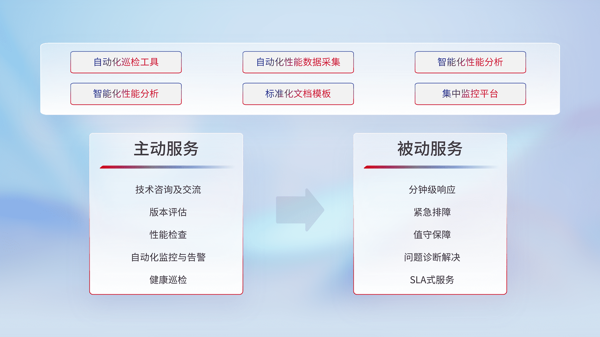 智能化工具和标准化文档,,保障服务质量,,,,提供主动服务(包含技术咨询、、、版本评估、、性能检查、、、自动化监控与告警、、、、健康巡检)和被动服务包含(分钟级响应、、紧急排障、、值守保障、、、问题诊断解决、、、SLA服务)。。。。